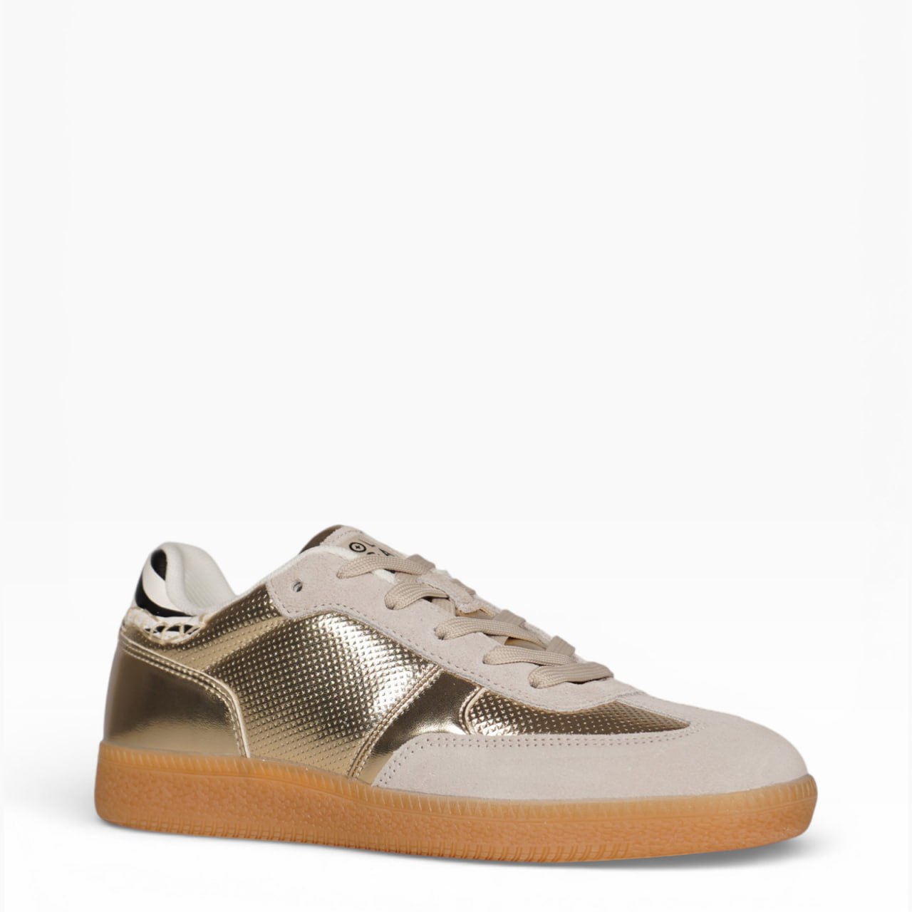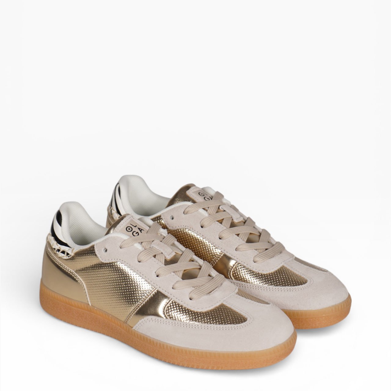 Dotée d’une semelle gomme antidérapante couleur camel, elle assure une excellente adhérence et un confort optimal pour un usage quotidien. Son design bicolore or & beige, ses lacets contrastés et ses finitions soignées apportent une touche casual chic idéale pour toutes vos tenues : jean, pantalon large, jogging ou robe décontractée.