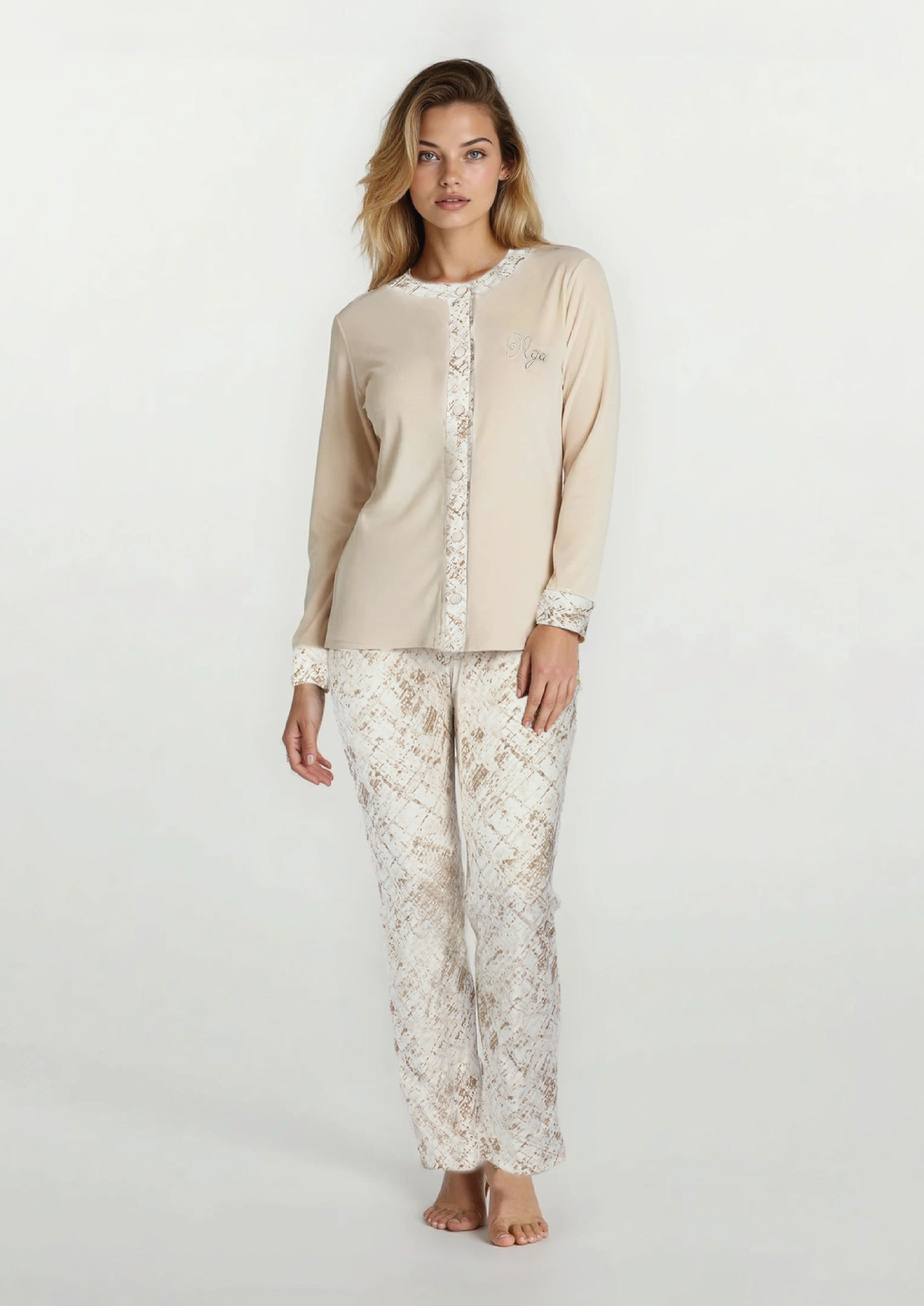 Découvrez ce pyjama femme élégant beige, parfait pour des nuits douces et confortables. Composé d’un haut manches longues en tissu doux avec une bande en dentelle délicate sur l’encolure, les poignets et la boutonnière, il offre une touche de féminité unique.