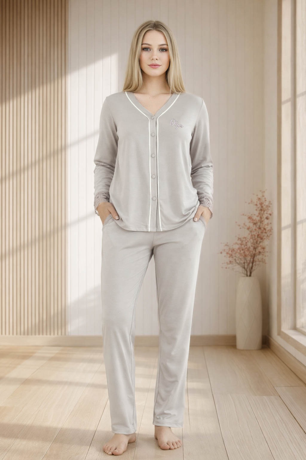 Ce pyjama femme deux pièces se compose d’un haut à manches longues avec fermeture à boutons et col en V délicat, sublimé par des finitions élégantes sur les manches. Il est accompagné d’un pantalon confortable à coupe droite qui assure un tombé fluide et agréable à porter.