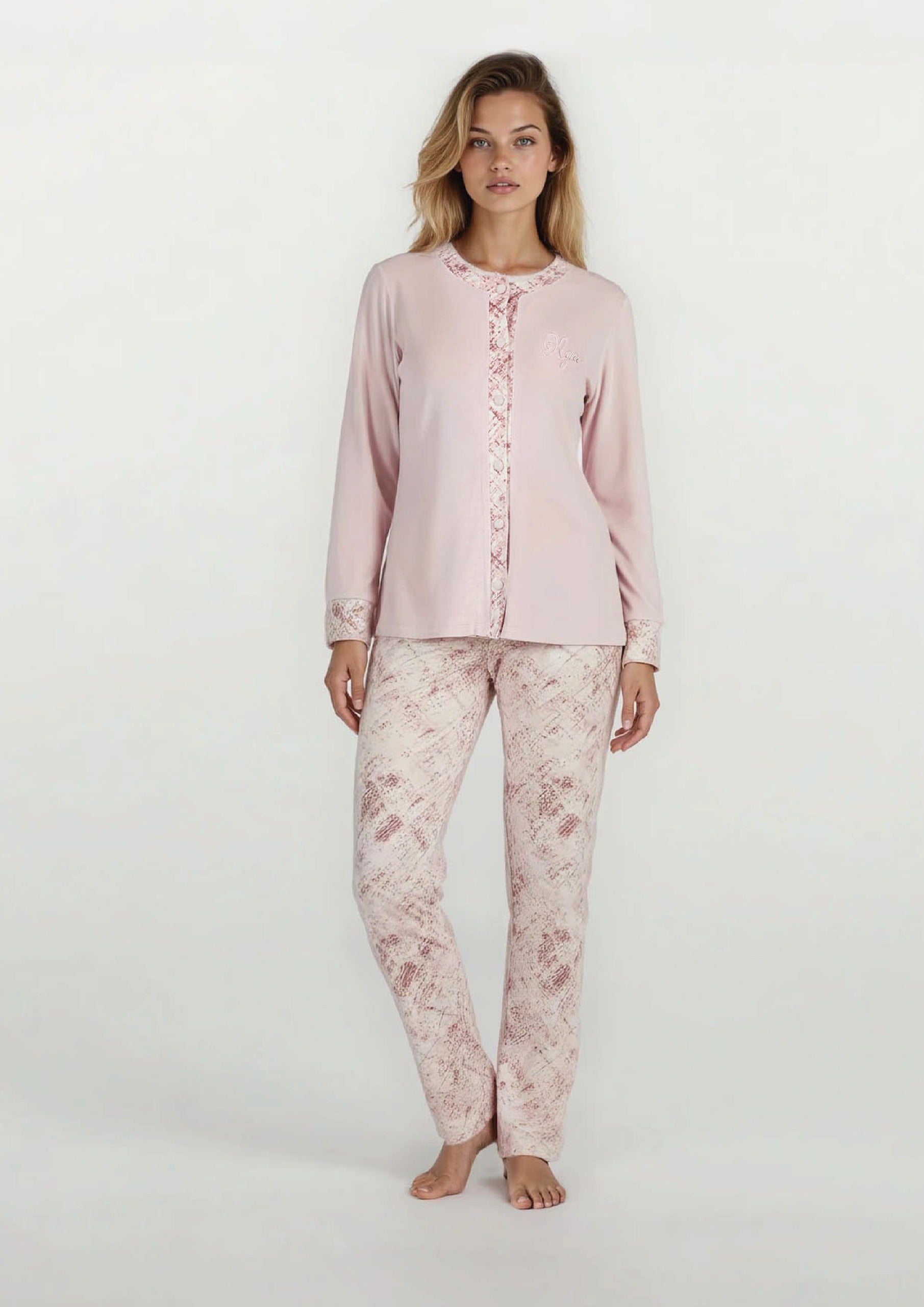 Découvrez ce pyjama femme élégant rose, parfait pour des nuits douces et confortables. Composé d’un haut manches longues en tissu doux avec une bande en dentelle délicate sur l’encolure, les poignets et la boutonnière, il offre une touche de féminité unique.