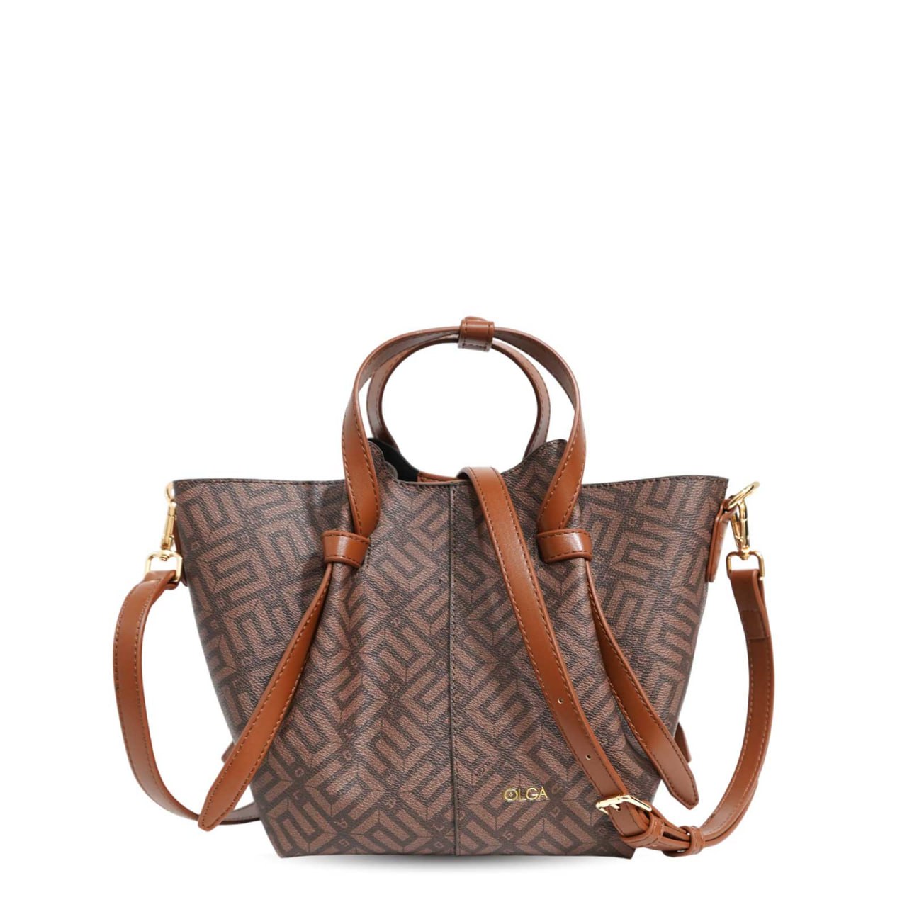 Découvrez ce sac à main femme OLGA au design chic et moderne, idéal pour un look tendance au quotidien. Conçu en similicuir de haute qualité, il présente un motif géométrique brun élégant, sublimé par des finitions en cuir marron caramel qui ajoutent une touche raffinée. Grâce à sa forme tote compacte, ce sac offre un espace pratique pour vos essentiels : portefeuille, téléphone, accessoires et maquillage.