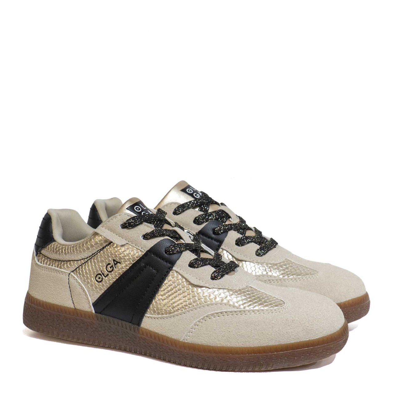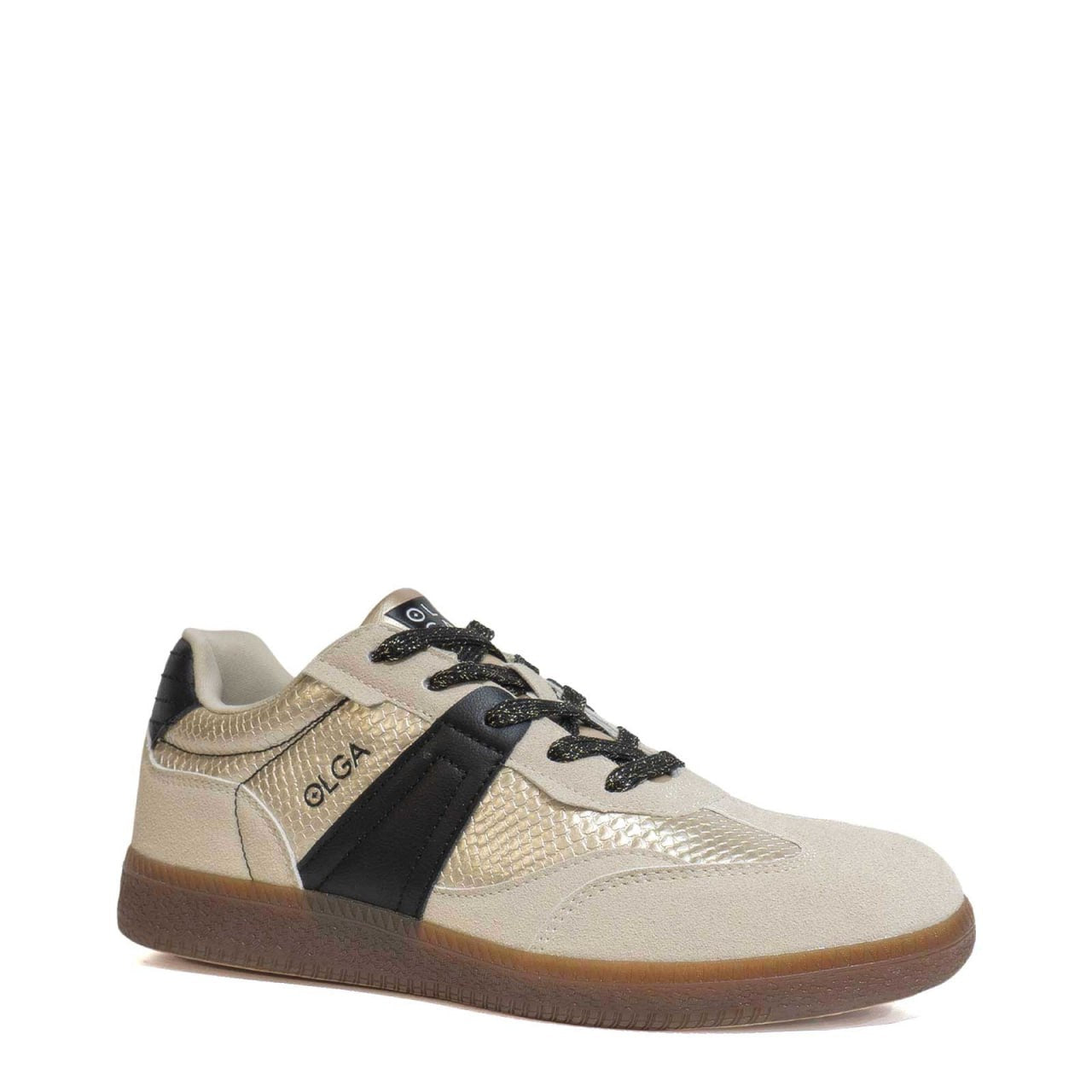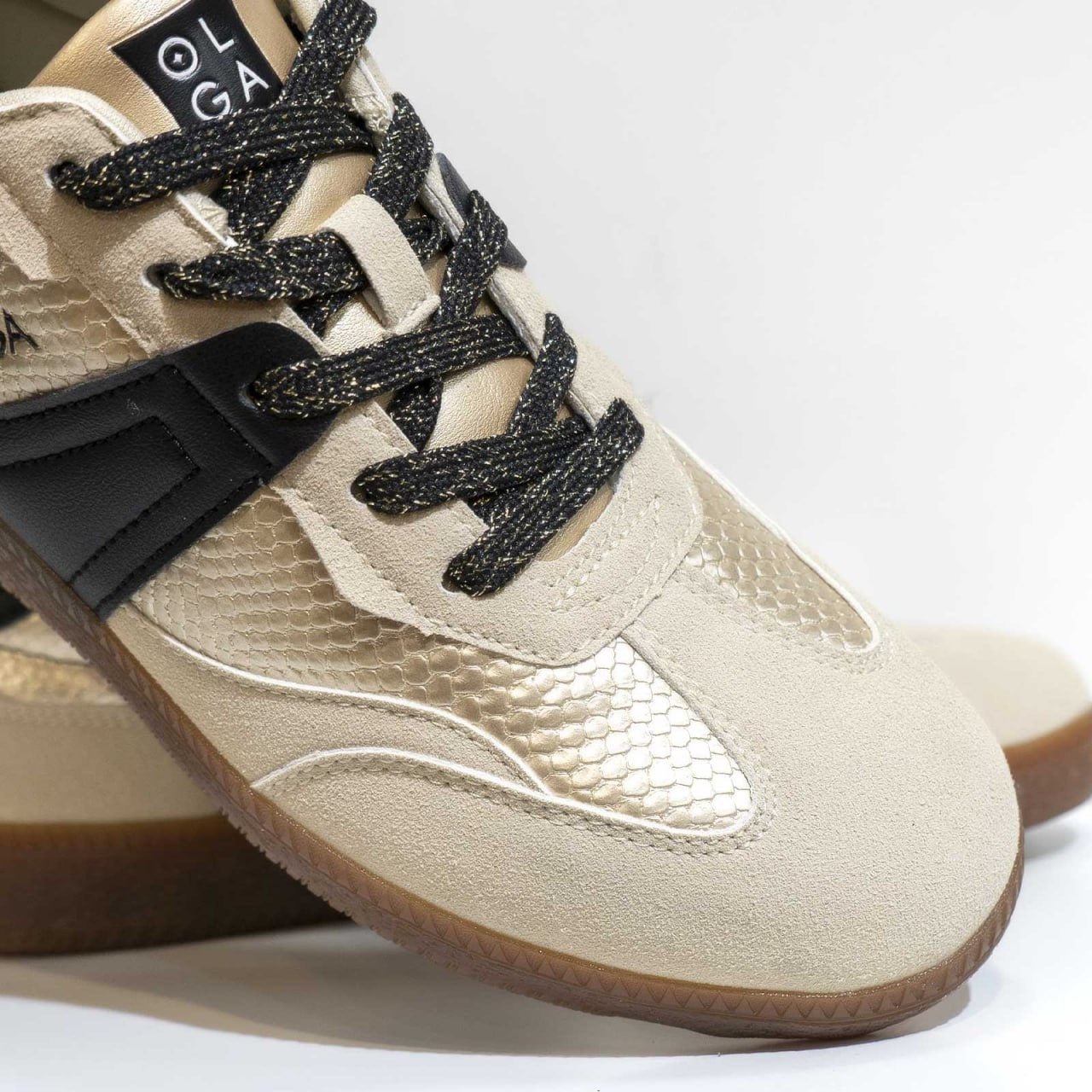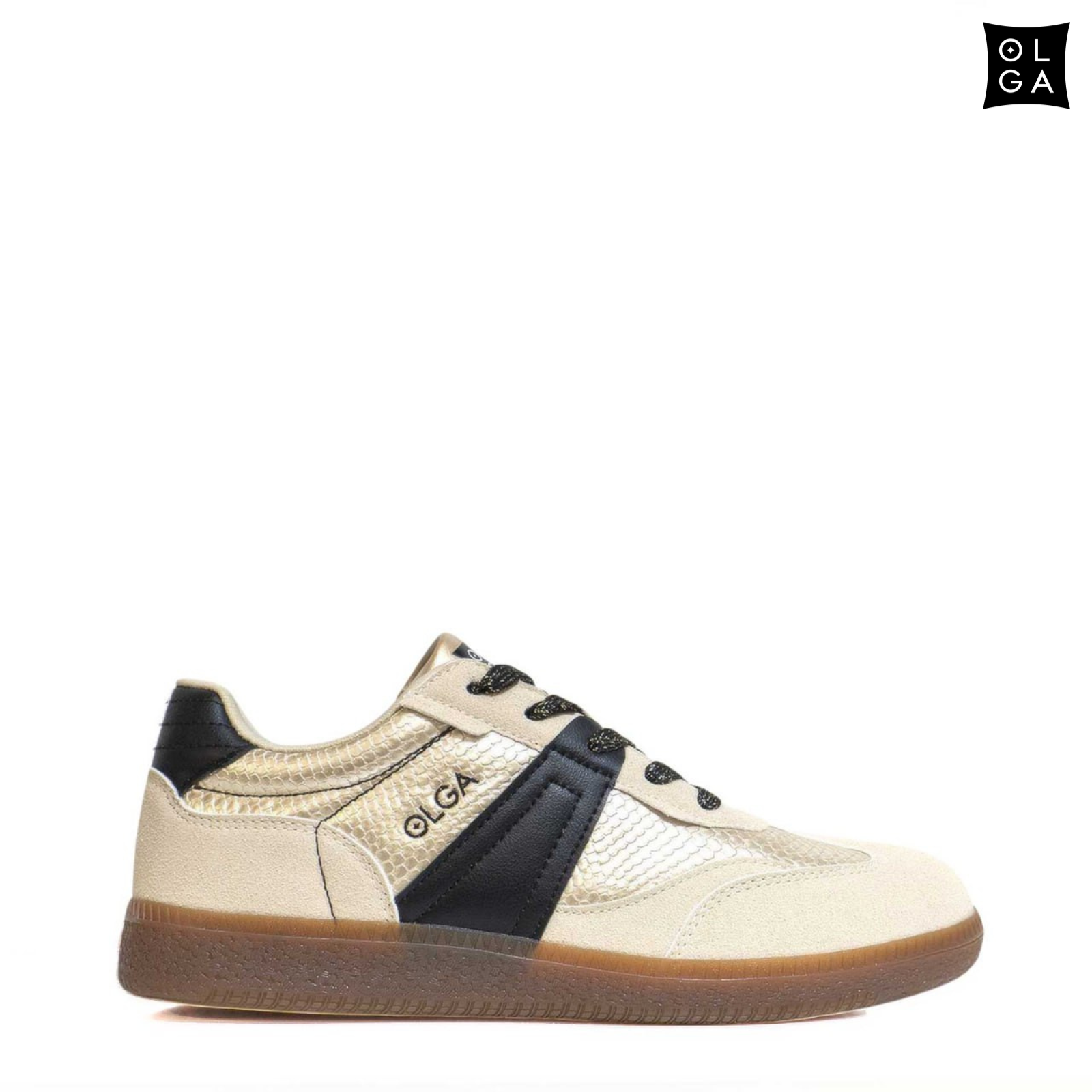 Affirmez votre style avec ces baskets femme OLGA alliant élégance moderne et confort absolu. Conçues dans un mélange raffiné de cuir synthétique doré effet python et de détails noirs contrastés, elles apportent une touche chic à toutes vos tenues.