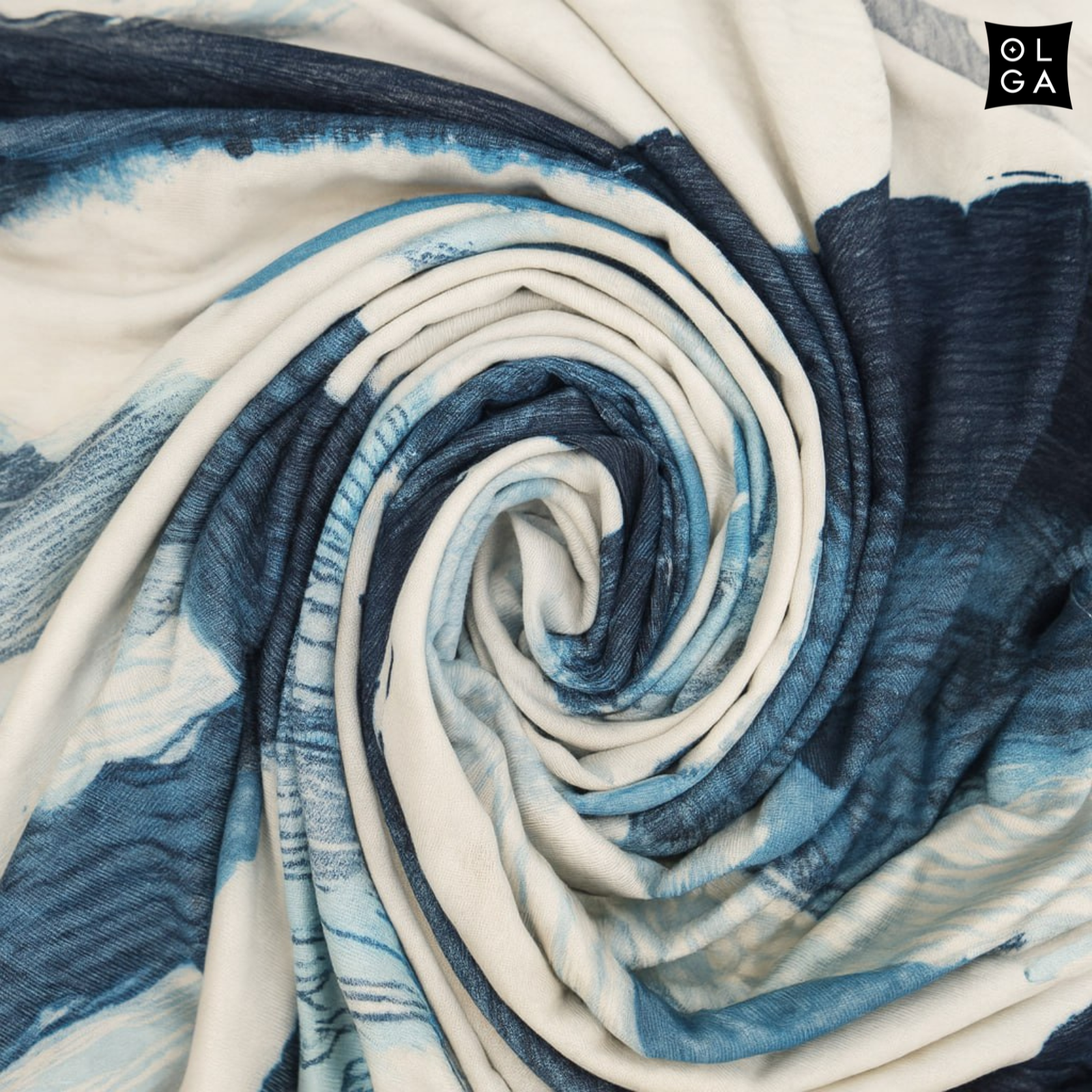 Ce châle élégant pour femme allie douceur et modernité grâce à son motif abstrait dans des tons bleu, blanc et vert clair.