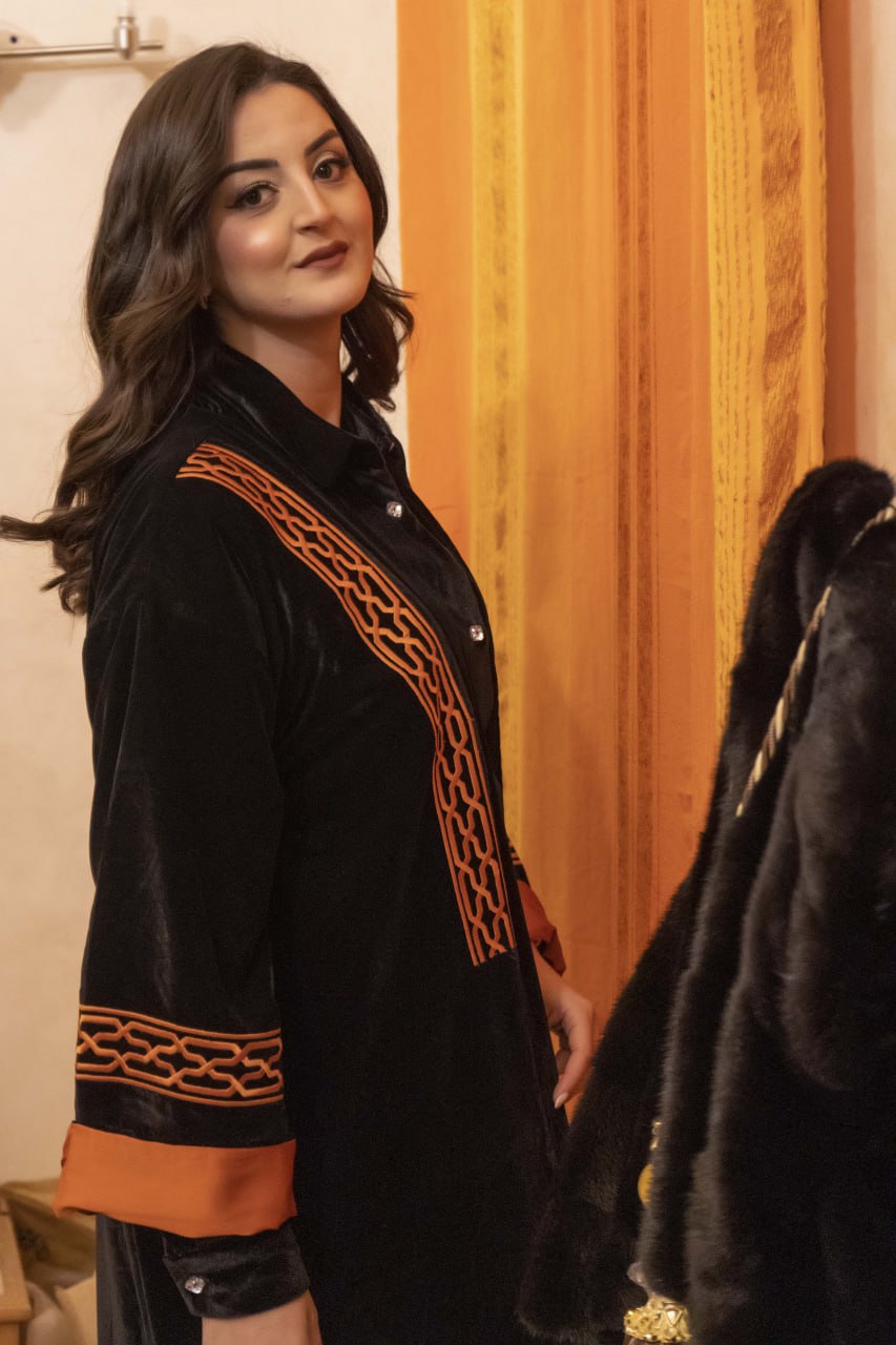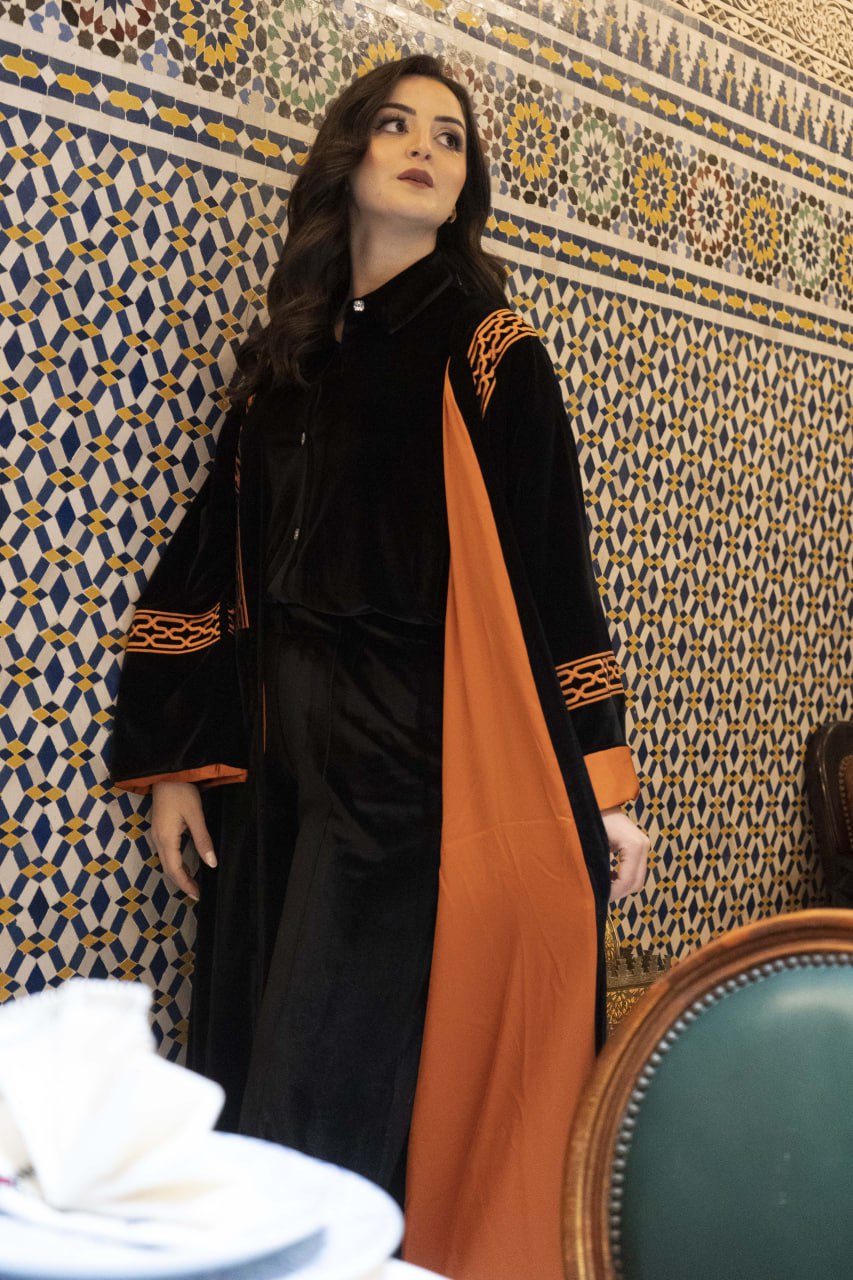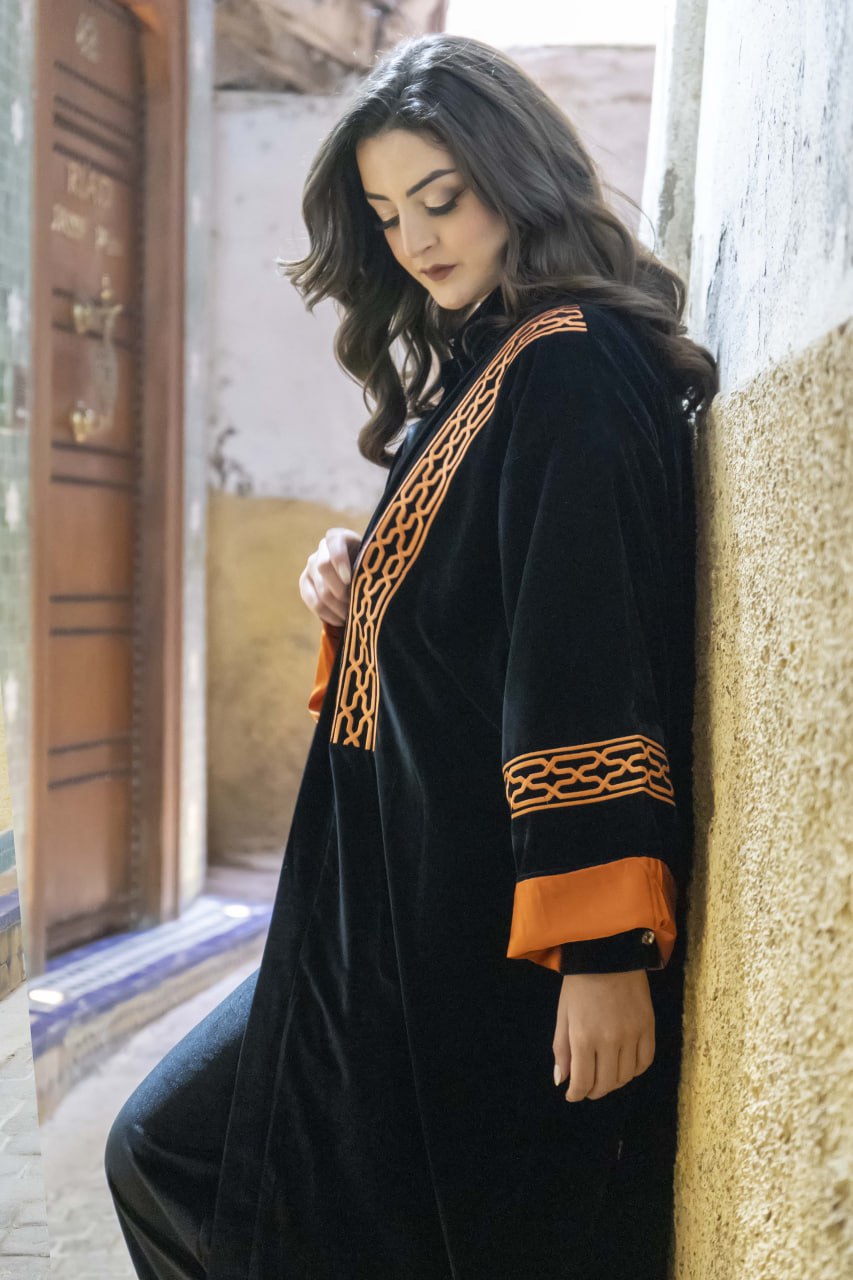 Véritable pièce d’exception, ce kimono traditionnel marocain incarne un raffinement intemporel. Confectionné dans un somptueux velours Noir au toucher riche et profond, il séduit par ses broderies artisanales couleurs orange inspirées des motifs marocains, délicatement travaillées pour révéler toute la noblesse du savoir-faire.